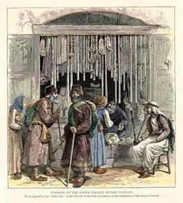 Text Box: صورة من القرن الثامن عشر تظهر الحجاج الروس يشتروزن الشموع